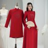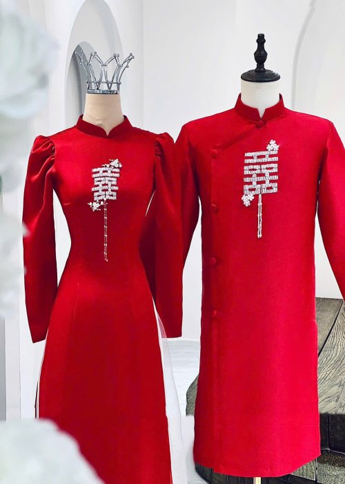 Cặp áo dài này nổi bật với màu đỏ rực rỡ, biểu tượng cho sự may mắn và hạnh phúc trong văn hóa Việt Nam. Chất liệu vải mềm mại, có độ bóng nhẹ, mang lại cảm giác thoải mái và sang trọng khi mặc. Form dáng áo được thiết kế ôm nhẹ nhàng, vừa vặn, giúp tôn lên vẻ duyên dáng và thanh lịch của người mặc. Điểm nhấn đặc biệt là họa tiết chữ in đậm màu trắng được thêu tỉ mỉ ở phần ngực, tạo nên sự ấn tượng và sang trọng, đồng thời kết hợp hài hòa với các chi tiết hoa văn truyền thống nhẹ nhàng trên nền vải đỏ. Phong cách của cặp áo dài là sự hòa quyện tinh tế giữa nét truyền thống và hiện đại, rất phù hợp cho các dịp lễ cưới hỏi, sự kiện quan trọng, thể hiện sự đồng điệu và tinh tế của cặp đôi.