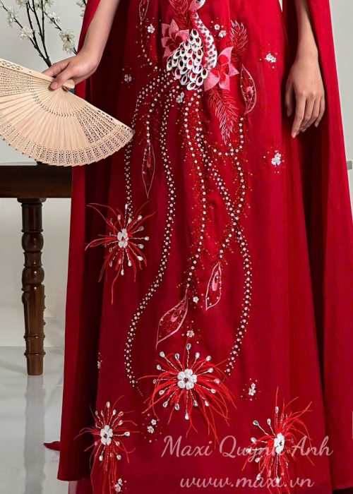 Thêu & đính kết tinh xảo: Họa tiết Long Phụng được thêu tỉ mỉ, kết hợp đính đá pha lê, kim tuyến và cườm cao cấp tạo nên sự lấp lánh nổi bật nhưng vẫn giữ vẻ thanh tao, trang nhã.