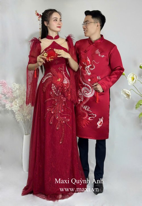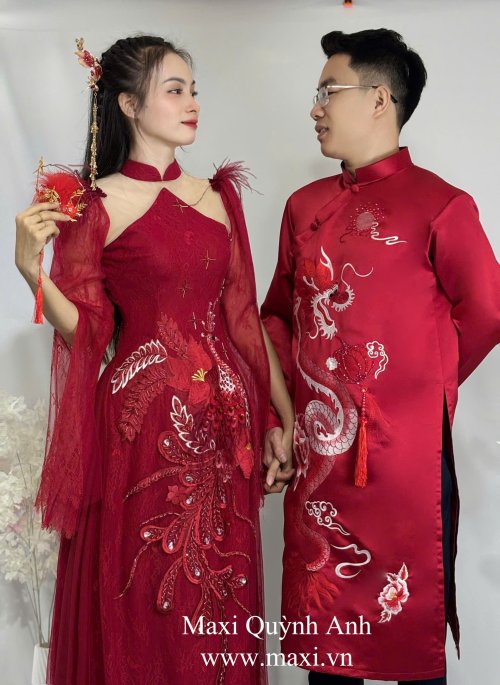 Cặp áo dài cưới đỏ thêu rồng – công là sự kết hợp hài hòa giữa nét kiêu sa, duyên dáng của người phụ nữ và phong thái uy nghi, bản lĩnh của người đàn ông trong ngày trọng đại. Lấy cảm hứng từ những biểu tượng cát tường trong văn hóa phương Đông, bộ trang phục không chỉ tôn vinh vẻ đẹp hình thể mà còn gửi gắm thông điệp về một cuộc hôn nhân vững bền, thịnh vượng và viên mãn.