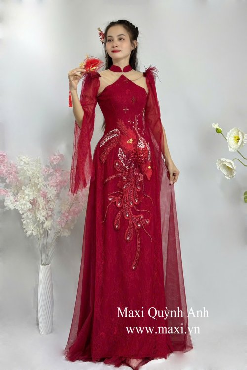 Áo dài cô dâu nổi bật với chất liệu ren nhập cao cấp, phối lụa nền tinh tế, ôm nhẹ đường cong và tạo độ bay mềm mại theo từng chuyển động. Trên nền vải đỏ quyến rũ, hình tượng chim công được thêu tay tỉ mỉ, sải cánh kiêu hãnh và rực rỡ như một nàng dâu kiều diễm trong ngày cưới. Chim công – biểu tượng của sắc đẹp, sự cao quý và may mắn – được khắc họa bằng kỹ thuật thêu tay truyền thống kết hợp chỉ ánh kim, đá và hạt nổi, mang đến hiệu ứng bắt sáng lộng lẫy và tinh xảo đến từng chi tiết.