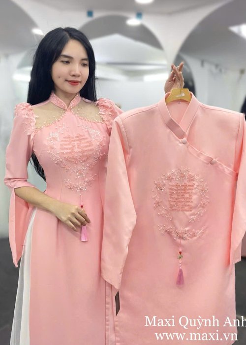 Ngọt ngào như ánh hoàng hôn cuối ngày, cặp áo dài cưới màu hồng mang theo hơi thở nhẹ nhàng, tinh tế của tình yêu đôi lứa. Áo dài cô dâu được thiết kế cách điệu với phần tay xẻ và khoét vai mềm mại, tôn lên nét nữ tính, duyên dáng nhưng vẫn giữ được sự kín đáo cần có trong nghi lễ truyền thống. Chất liệu lụa cao cấp mịn màng ôm lấy vóc dáng, kết hợp cùng sắc hồng pastel dịu nhẹ, khiến nàng dâu trở nên vừa mong manh vừa đầy khí chất.”