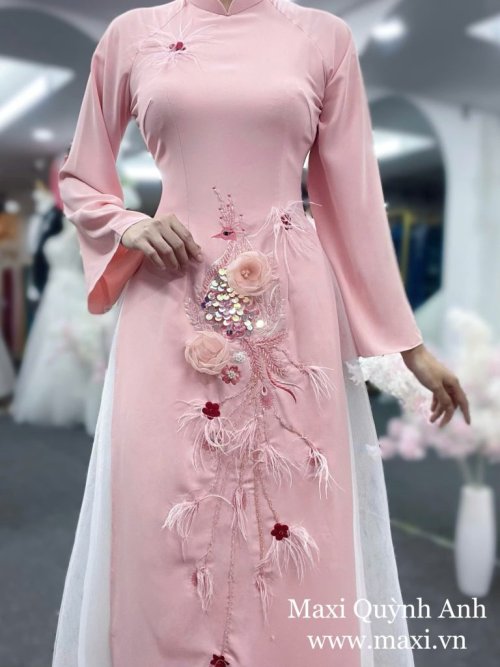 Áo dài nữ với gam hồng pastel ngọt ngào, thiết kế form dáng thướt tha, điểm nhấn là họa tiết 3D hoa nổi tinh xảo, cùng tà voan mềm mại giúp cô dâu thêm phần duyên dáng và quyến rũ.