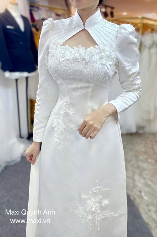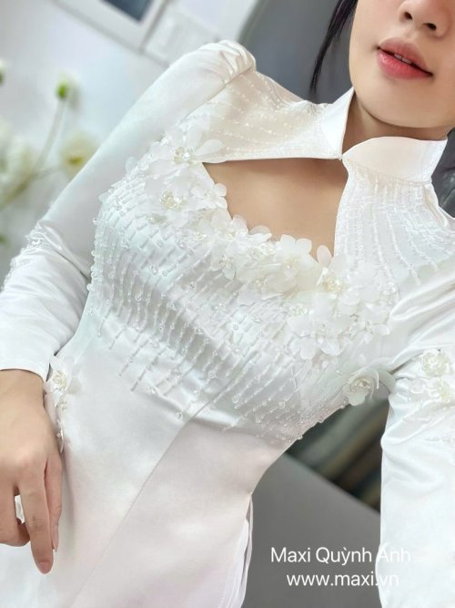 Áo dài nữ nổi bật với thiết kế cổ cách điệu độc đáo, phần ngực được xếp ly tinh tế cùng họa tiết đính kết hoa nổi trải dài từ ngực xuống tà áo, giúp cô dâu thêm phần thanh thoát và duyên dáng.