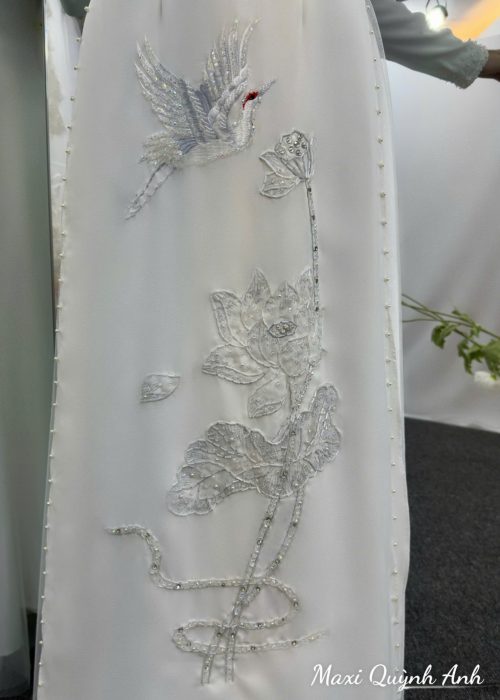Áo cô dâu với thiết kế áo dài truyền thống với tà bay bổng, tôn lên vẻ đẹp dịu dàng và duyên dáng. Điểm nhấn là họa tiết chim hạc và hoa thêu nổi được thêu tỉ mỉ, đính kết pha lê lấp lánh ở ngực áo, tạo nên sự kiêu sa và thanh thoát. Áo chú rể với phom áo dài cách tân màu trắng, thiết kế cổ vạt chéo phá cách, mang đến vẻ ngoài lịch lãm và hiện đại. Họa tiết rồng được thêu nổi bật, tinh xảo, thể hiện sự mạnh mẽ và quyền uy của người đàn ông.