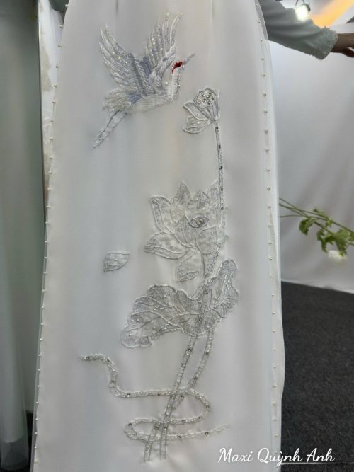 Áo cô dâu với thiết kế áo dài truyền thống với tà bay bổng, tôn lên vẻ đẹp dịu dàng và duyên dáng. Điểm nhấn là họa tiết chim hạc và hoa thêu nổi được thêu tỉ mỉ, đính kết pha lê lấp lánh ở ngực áo, tạo nên sự kiêu sa và thanh thoát. Áo chú rể với phom áo dài cách tân màu trắng, thiết kế cổ vạt chéo phá cách, mang đến vẻ ngoài lịch lãm và hiện đại. Họa tiết rồng được thêu nổi bật, tinh xảo, thể hiện sự mạnh mẽ và quyền uy của người đàn ông.