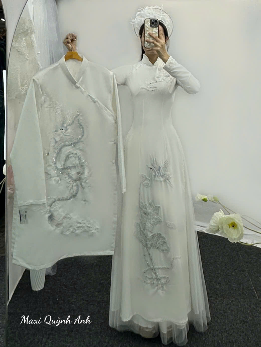 Điểm nhấn là sự kết hợp của biểu tượng rồng và chim hạc mang ý nghĩa “long phụng sum vầy”, biểu tượng cho hạnh phúc đôi lứa và sự hòa hợp âm dương. Đây không chỉ là trang phục cưới, mà còn là lời chúc phúc ý nghĩa cho một cuộc sống hôn nhân bền vững và thịnh vượng.