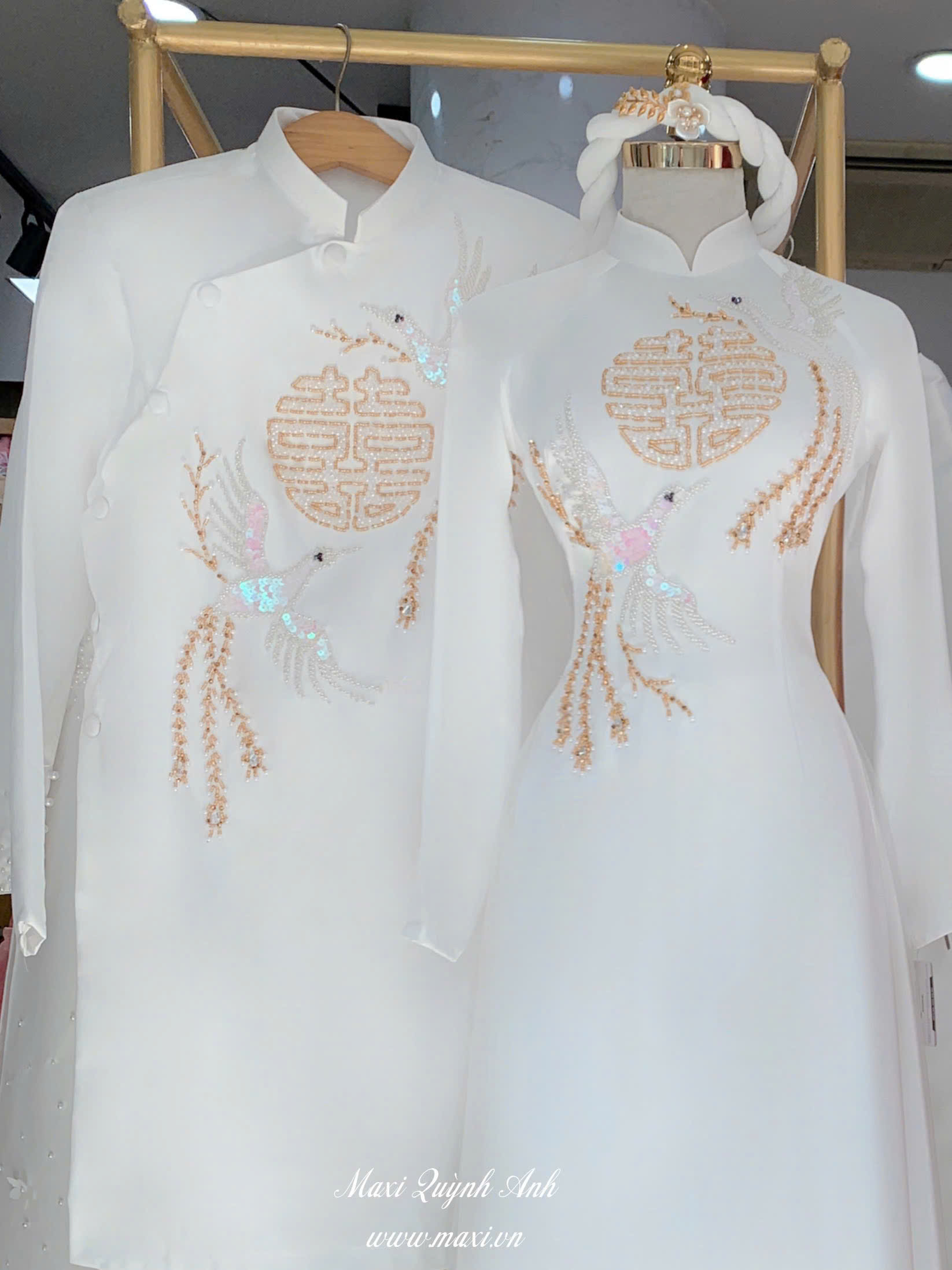 - Họa tiết Song Hỷ và chim Phụng/Hạc thêu tay thủ công vô cùng tinh xảo và sống động. Đây không chỉ là trang trí, mà còn là lời chúc phúc cho một cuộc sống hôn nhân viên mãn, sắt son và hạnh phúc đủ đầy.