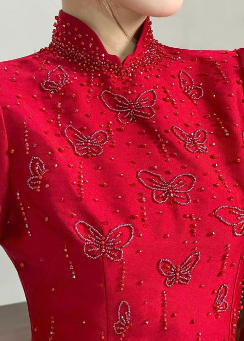 Áo của cô dâu được thiết kế với phom dáng ôm, cổ cao truyền thống, kết hợp họa tiết đính kết tinh xảo ở ngực, tạo điểm nhấn. Tà áo có hai lớp: lớp trong bằng lụa trơn và lớp ngoài là chất liệu gấm hoa cao cấp, tạo sự bồng bềnh thướt tha. Áo của chú rể được thiết kế dáng suông, cổ cao với hàng cúc chéo, thể hiện sự thanh lịch và nam tính, đồng điệu với họa tiết trên áo cô dâu.