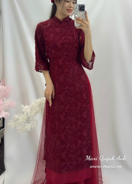 Cặp áo dài cưới được thiết kế từ lụa gấm đỏ đô cao cấp, mang sắc màu ấm áp tượng trưng cho hạnh phúc và may mắn. Áo dài cô dâu nổi bật với họa tiết gấm hoa chìm tinh xảo trải đều trên thân áo, kết hợp lớp voan dài mềm mại phía sau, tạo cảm giác bồng bềnh và duyên dáng khi di chuyển. Áo dài chú rể đồng điệu về chất liệu và gam màu, thiết kế tối giản nhưng vẫn toát lên vẻ lịch lãm và mạnh mẽ. Sự kết hợp tinh tế này giúp cô dâu – chú rể tỏa sáng, hài hòa và nổi bật trong mọi khoảnh khắc của ngày cưới.