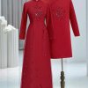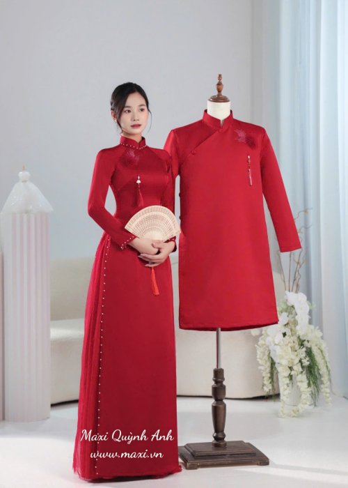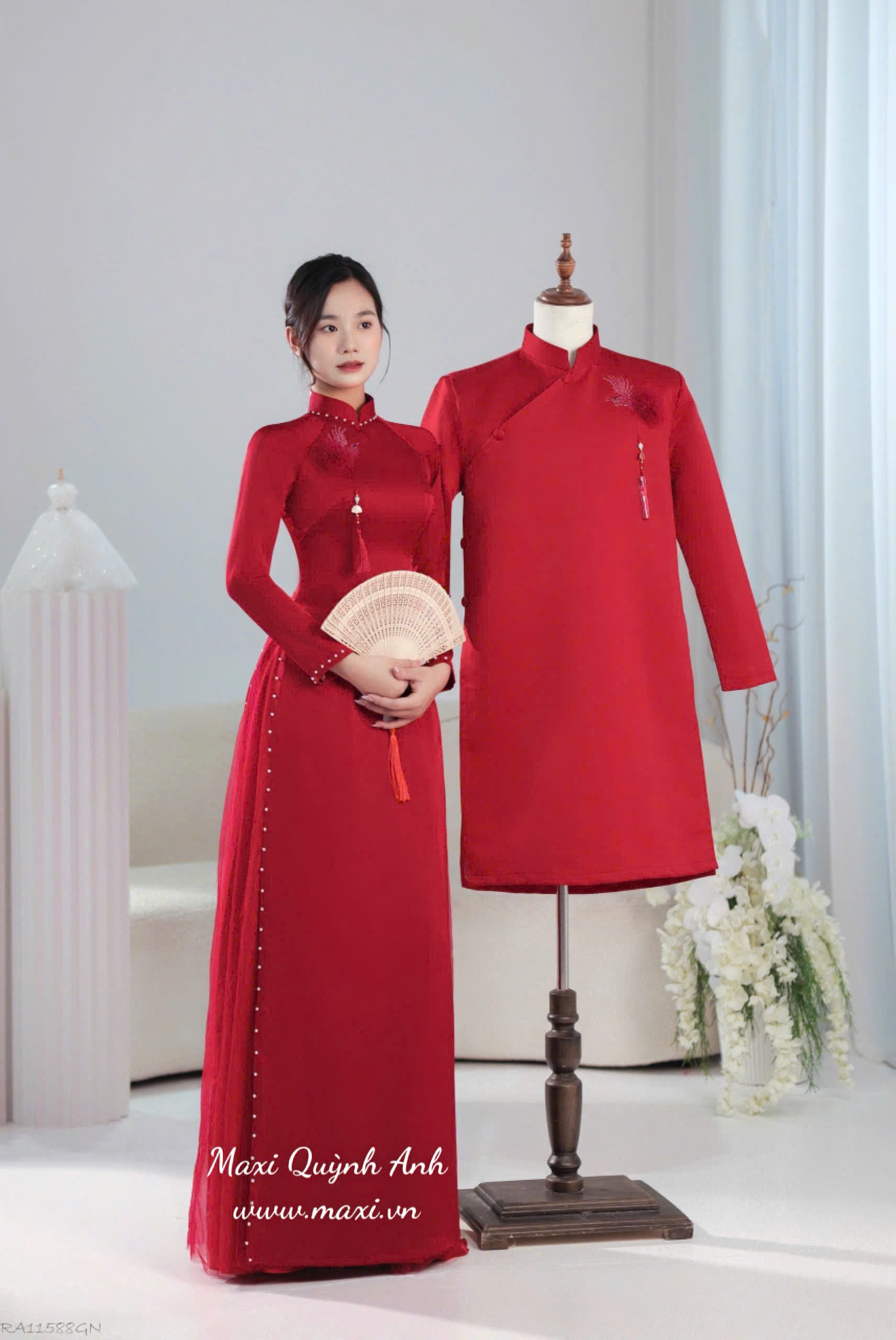 Cặp áo dài cưới đỏ sang trọng, được may từ lụa cao cấp mềm mịn, tôn lên vẻ đẹp duyên dáng và thanh lịch. Áo dài nữ nổi bật với hàng cúc ngọc trai chạy dọc tà áo và đường viền đính đá tinh xảo, mang lại cảm giác vừa truyền thống vừa hiện đại. Áo dài nam thiết kế cổ đứng lịch lãm, kết hợp họa tiết kết tinh tế ở ngực, tạo điểm nhấn nổi bật. Sắc đỏ may mắn tượng trưng cho hạnh phúc và viên mãn trong ngày cưới. Đây là lựa chọn hoàn hảo cho cặp đôi yêu thích sự trang nhã nhưng vẫn muốn toát lên nét sang trọng trong lễ thành hôn.