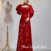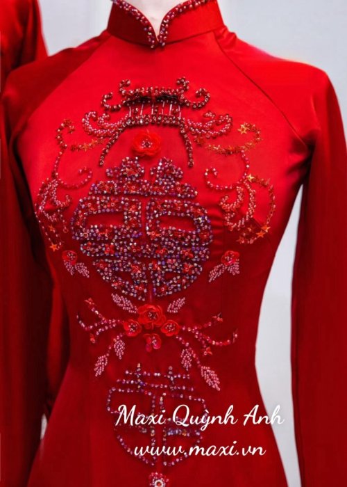 Áo cô dâu được thiết kế trên nền lụa đỏ cao cấp, ôm dáng thanh thoát, điểm xuyết chi tiết thêu tay hoặc đính hoa nhẹ nhàng, tôn lên vẻ yêu kiều, duyên dáng. Tà áo dài mềm mại theo từng bước chân, như chính sự e ấp và ngọt ngào của nàng dâu mới trong ngày trọng đại.