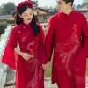 Mang sắc đỏ truyền thống tượng trưng cho hạnh phúc viên mãn và tình yêu vĩnh cửu, cặp áo dài cưới này là biểu tượng của sự giao hòa giữa nét đẹp văn hóa xưa và gu thẩm mỹ hiện đại.