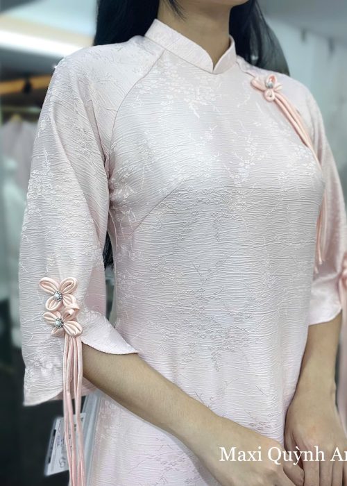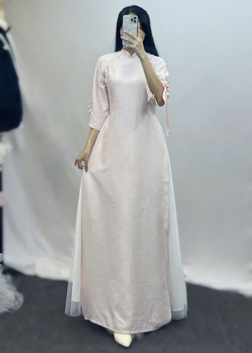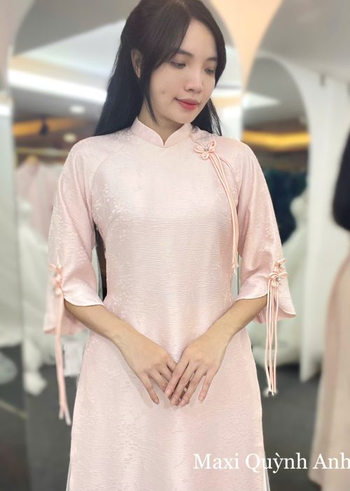 Phong cách: Chiếc áo dài mang sắc hồng pastel dịu dàng, tôn lên vẻ đẹp trong trẻo và thanh khiết của người phụ nữ. Thiết kế tinh giản nhưng tinh tế, nhấn nhá bằng chi tiết nút cài thủ công ở vai và tay áo tạo điểm nhấn nhẹ nhàng mà duyên dáng. Đây là sự lựa chọn hoàn hảo cho những ai yêu thích sự thanh lịch và nhẹ nhàng, phù hợp trong nhiều dịp quan trọng.