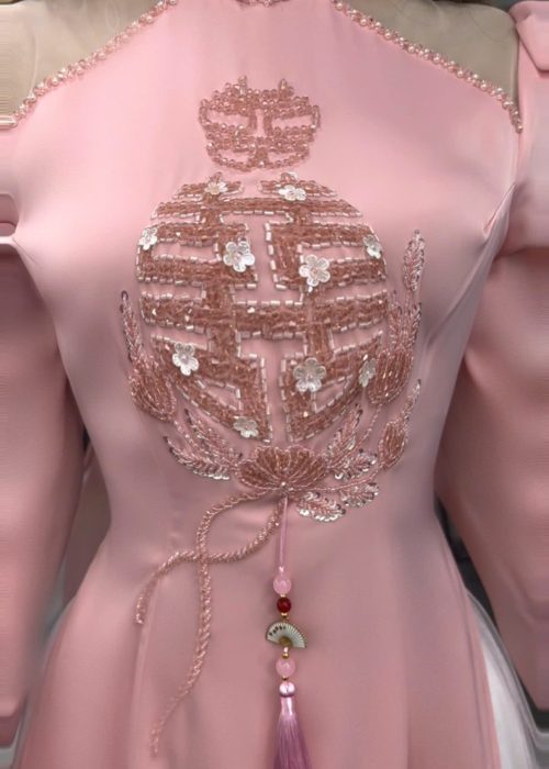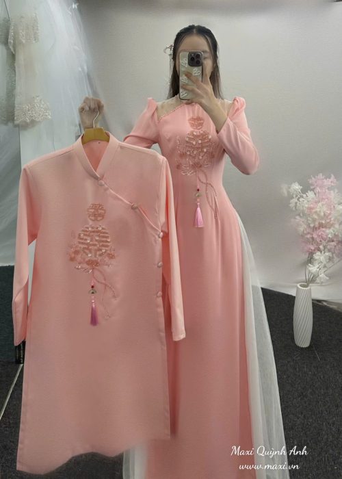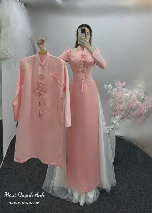 Cặp áo dài cưới màu hồng kết chữ ‘Hỷ’ là bản hòa ca nhẹ nhàng và tinh tế dành riêng cho những đôi uyên ương yêu thích vẻ đẹp thanh lịch nhưng vẫn đậm đà ý nghĩa truyền thống. Trên nền sắc hồng dịu ngọt – biểu tượng của sự ngây thơ, ấm áp và viên mãn – áo dài cô dâu được thiết kế tối giản nhưng tinh tế, nổi bật với chi tiết chữ ‘Hỷ’ kết thủ công tỉ mỉ nơi ngực áo, như một lời chúc phúc khéo léo và thiêng liêng dành cho ngày trọng đại.