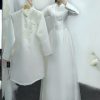 Áo cô dâu màu trắng tinh khôi với họa tiết thêu hoa tinh tế và đính kết hạt cườm nhẹ nhàng ở ngực áo, tôn lên vẻ đẹp dịu dàng. Áo chú rể lịch lãm với thiết kế cổ trụ cách tân và họa tiết hoa văn đồng điệu, tạo nên sự hài hòa hoàn hảo.