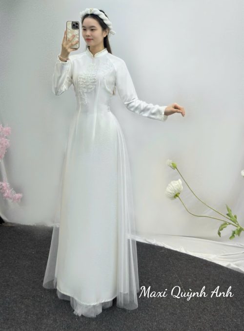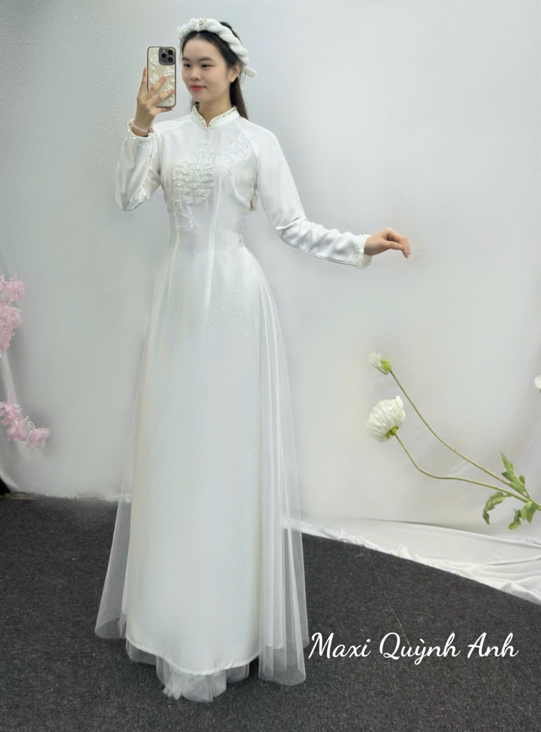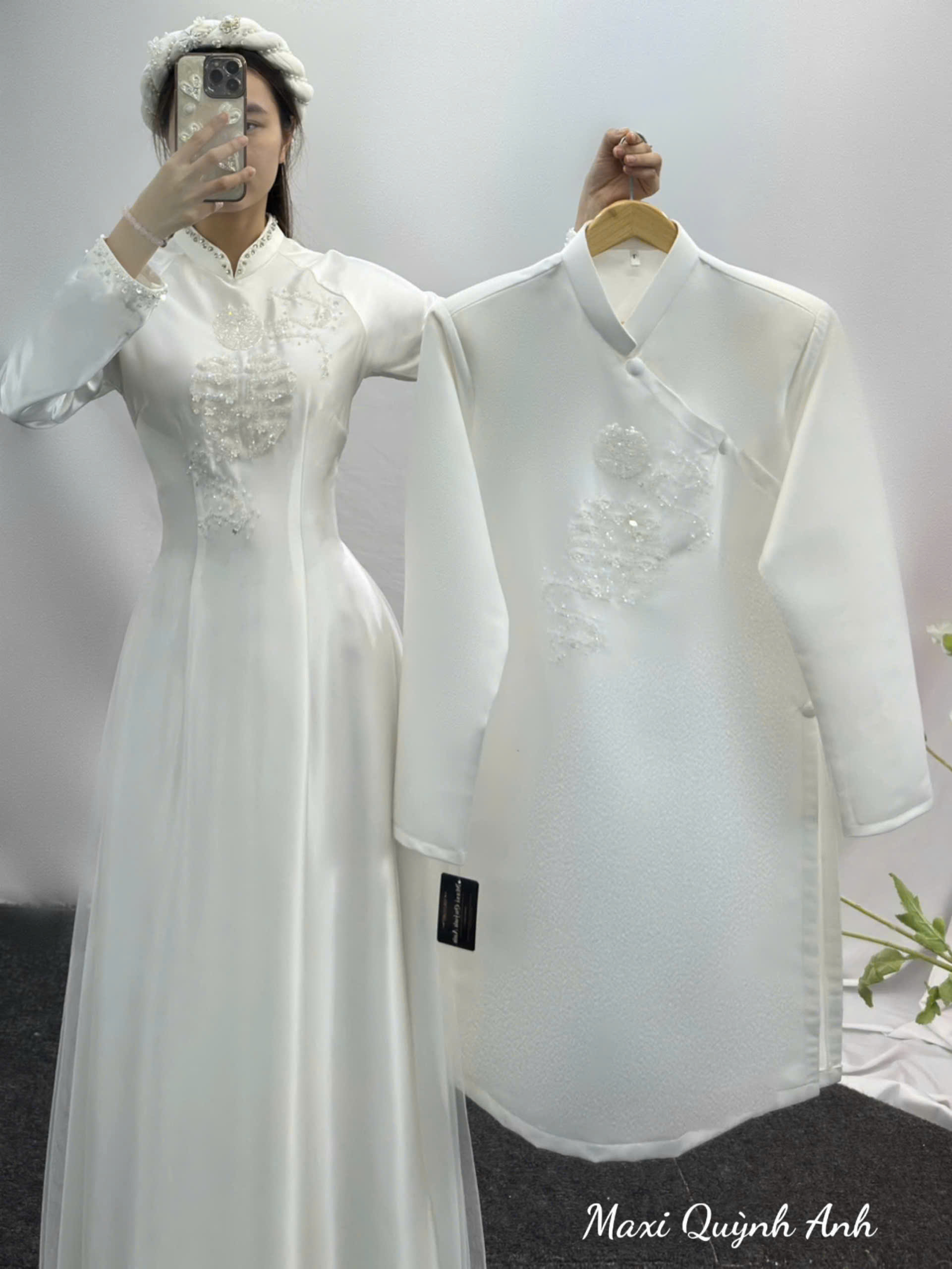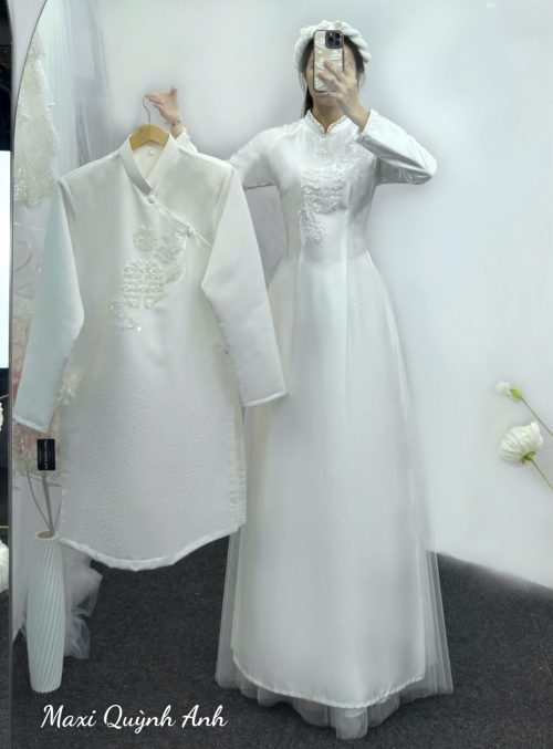 Cặp Áo Dài Hỷ Trắng Đính Kết Cao Cấp