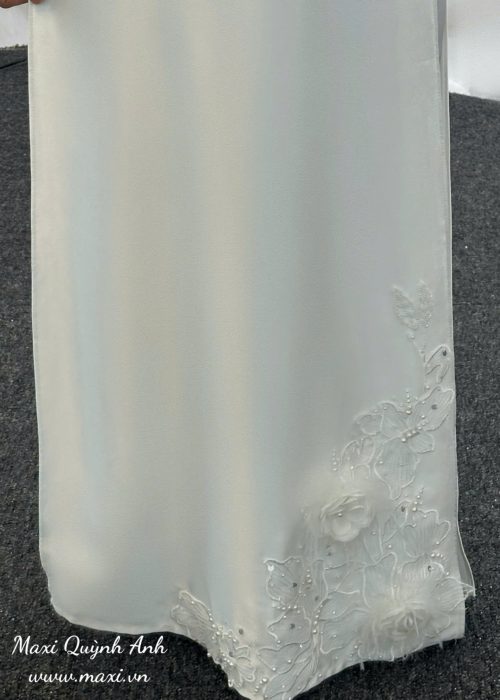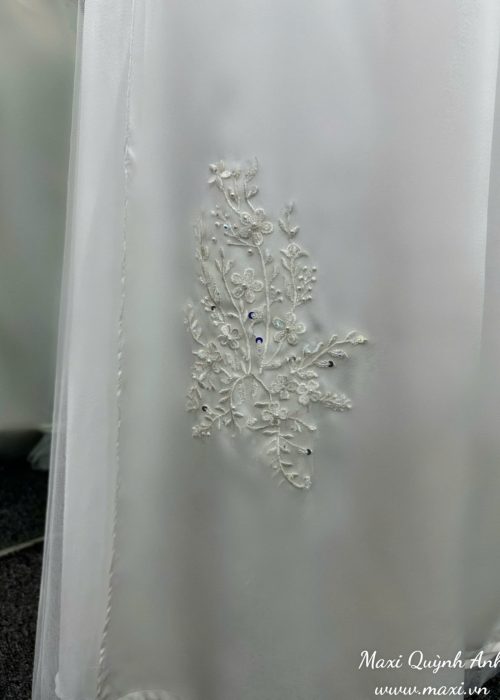 Áo dài nữ được thiết kế với form dáng ôm gọn, tôn lên đường nét duyên dáng của cô dâu. Điểm nhấn nổi bật là hoa văn thêu tinh tế dọc tà áo, kết hợp cùng chất liệu vải mềm mại, tạo nên sự sang trọng và dịu dàng.