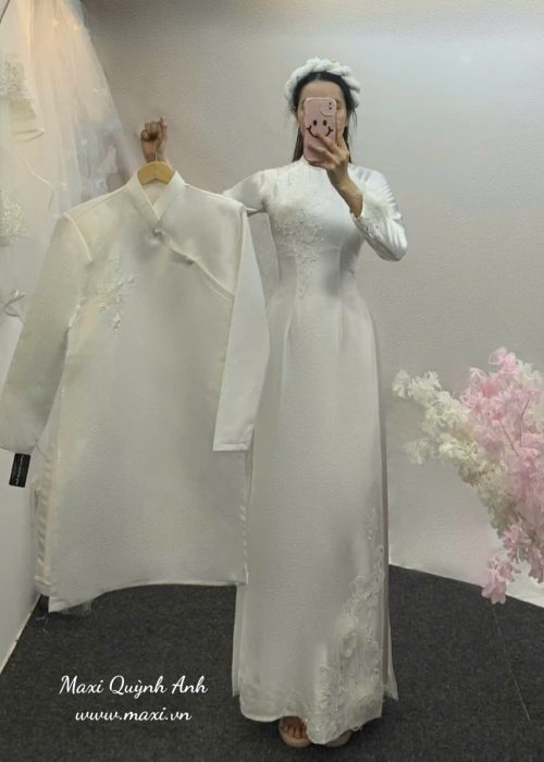 Cặp áo dài cưới trắng mang đến vẻ đẹp tinh khôi và thanh lịch, phù hợp cho các nghi lễ trọng đại.