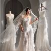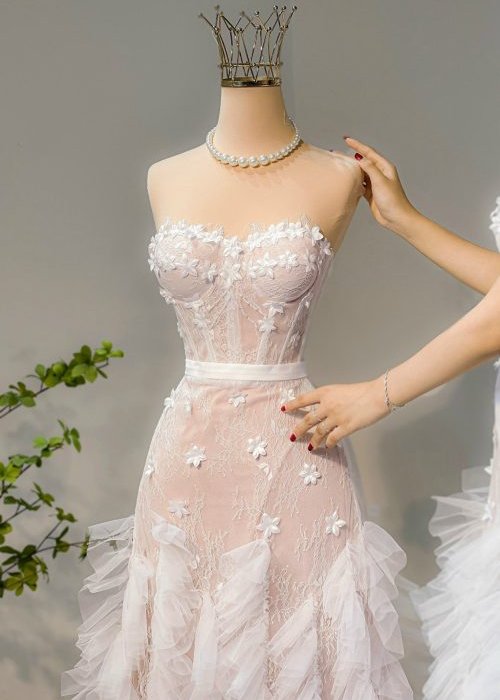 Một thiết kế váy cưới dài, không dây với kiểu dáng ôm sát phần thân trên và xòe nhẹ từ eo trở xuống, tạo nên sự mềm mại, bay bổng và rất nữ tính. Chất liệu chính của váy là vải voan hoặc ren mỏng nhẹ, trong suốt, giúp làm nổi bật các chi tiết hoa 3D được đính tỉ mỉ ở phần ngực và thân váy, càng tăng thêm nét sang trọng, tinh tế cho tổng thể thiết kế. Phần chân váy có hiệu ứng xếp tầng với các lớp vải bèo nhún và chồng lên nhau, tạo cảm giác bồng bềnh, mềm mại, tự nhiên như những đám mây trắng nhẹ nhàng. Màu trắng tinh khôi của váy không chỉ tượng trưng cho sự trong sáng, mà còn làm nổi bật vóc dáng người mặc.