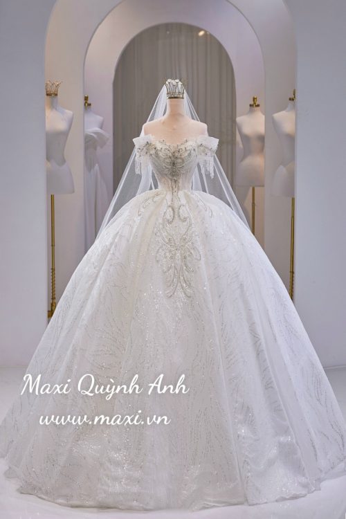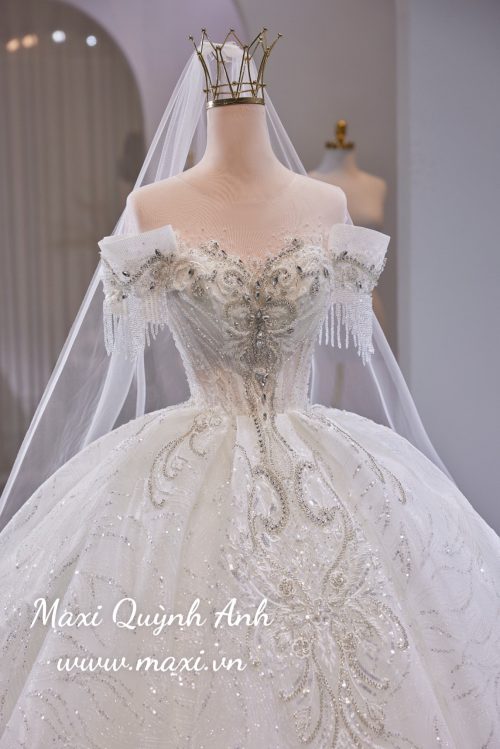 👰 Form dáng xòe phồng (ball gown) cực đại, tạo sự hoành tráng và lộng lẫy tuyệt đối. Điểm nhấn là thiết kế trễ vai tinh tế kết hợp với phần thân áo được siết eo corset, giúp tôn lên đường cong hoàn hảo và vẻ ngoài thanh lịch, quý phái.