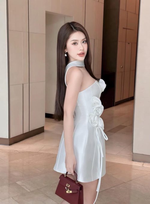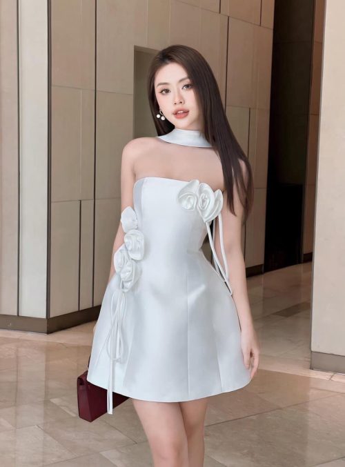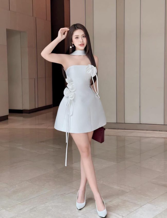 Chiếc đầm phù hợp để diện trong các buổi tiệc, sự kiện, dạo phố hoặc hẹn hò. Nó mang lại vẻ ngoài vừa thanh lịch, vừa gợi cảm và trẻ trung. Đầm có phom dáng xòe nhẹ (A-line), độ dài trên gối (mini dress) giúp khoe đôi chân thon dài. Váy có thiết kế quây ngực (strapless), để lộ bờ vai và xương quai xanh. Đặc biệt, đầm được kết hợp với một chi tiết cổ yếm (halter neck) mỏng, màu trắng, tạo điểm nhấn độc đáo và hiện đại.