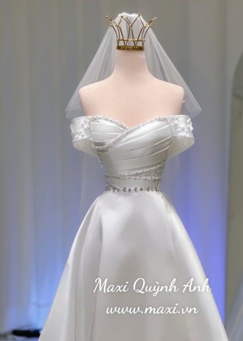 Chiếc váy cưới trắng tinh khôi mang phong cách sang trọng và quý phái. Váy có thiết kế trễ vai gợi cảm, với phần thân trên được xếp nếp tinh tế bằng chất liệu phi Hàn bóng nhẹ, tạo vẻ mềm mại. Phần eo được siết chặt với một dải đính đá, pha lê lấp lánh, tạo điểm nhấn nổi bật và tôn lên vòng eo thon gọn. Chân váy xòe bồng bềnh, rủ mềm mại, làm từ chất liệu phi cao cấp, mang lại cảm giác sang trọng và cổ điển. Váy được kết hợp cùng voan và vương miện nhỏ, tạo nên vẻ ngoài lộng lẫy, kiêu sa như công chúa.