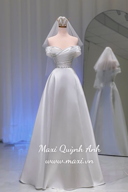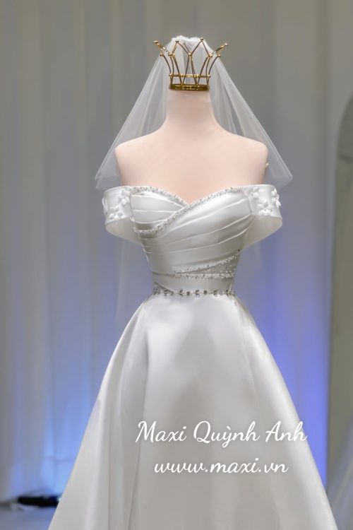 Chiếc váy cưới trắng tinh khôi mang phong cách sang trọng và quý phái. Váy có thiết kế trễ vai gợi cảm, với phần thân trên được xếp nếp tinh tế bằng chất liệu phi Hàn bóng nhẹ, tạo vẻ mềm mại. Phần eo được siết chặt với một dải đính đá, pha lê lấp lánh, tạo điểm nhấn nổi bật và tôn lên vòng eo thon gọn. Chân váy xòe bồng bềnh, rủ mềm mại, làm từ chất liệu phi cao cấp, mang lại cảm giác sang trọng và cổ điển. Váy được kết hợp cùng voan và vương miện nhỏ, tạo nên vẻ ngoài lộng lẫy, kiêu sa như công chúa.