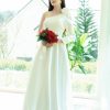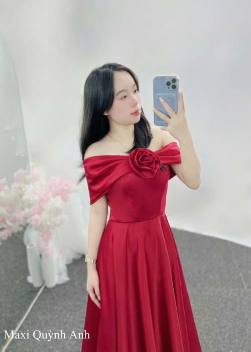 Chiếc đầm dạ hội đỏ mang thiết kế cúp vai trễ vai quyến rũ, tạo điểm nhấn nổi bật với bông hoa bản lớn trước ngực được xếp thủ công tỉ mỉ, vừa tinh tế vừa sang trọng. Phần eo được bo nhẹ, ôm vừa vặn để tôn lên vòng eo thon gọn, kết hợp cùng chân váy xòe dài thướt tha giúp người mặc thêm phần duyên dáng, kiêu sa.