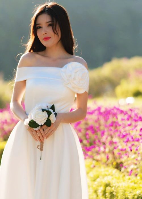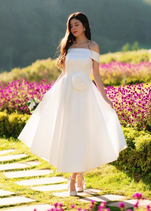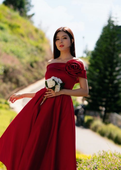 Đầm Dạ Hội Trễ Vai (2 màu) Kèm Hoa Rời