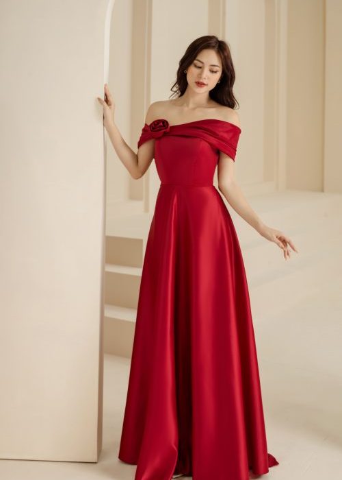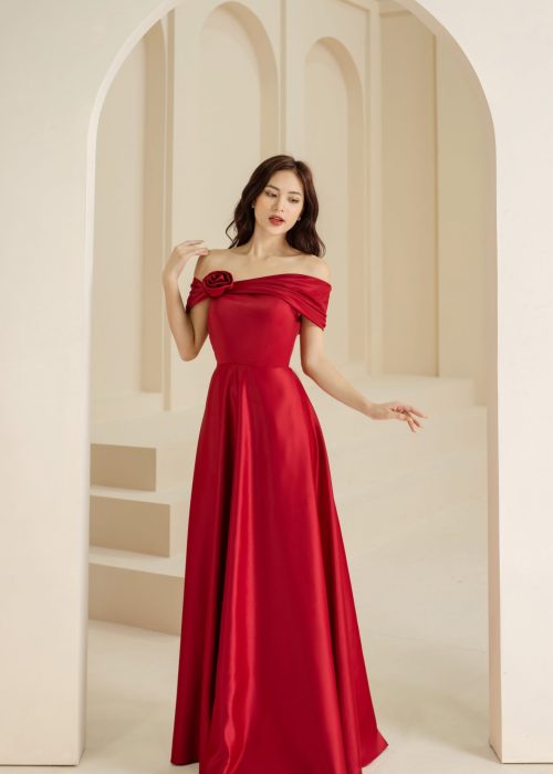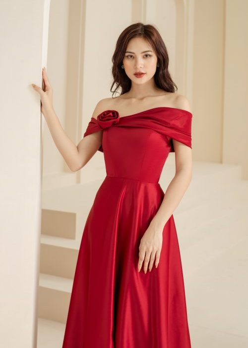 Đầm Dạ Hội Trễ Vai Hoa Hồng Ngực Đỏ