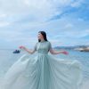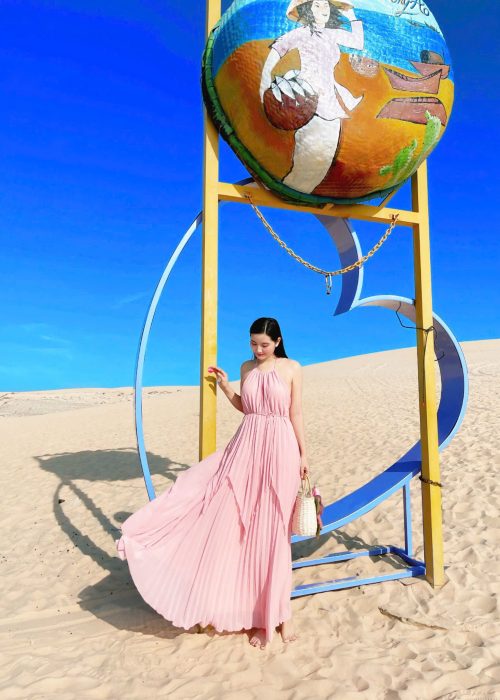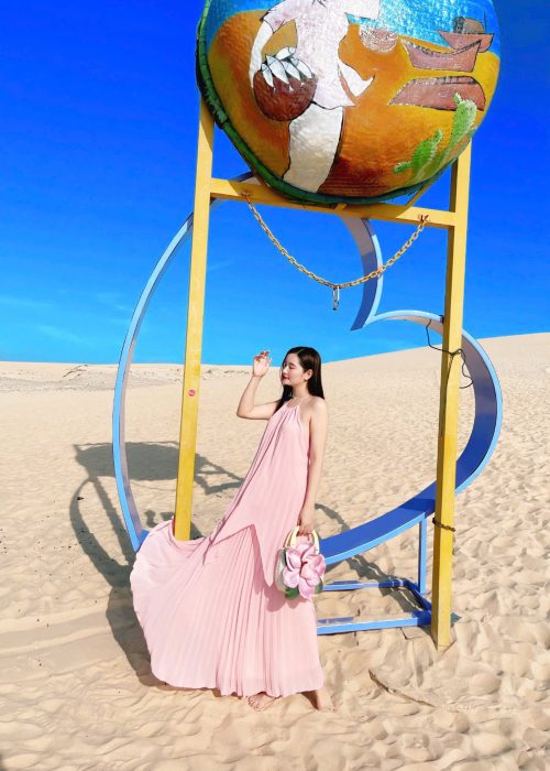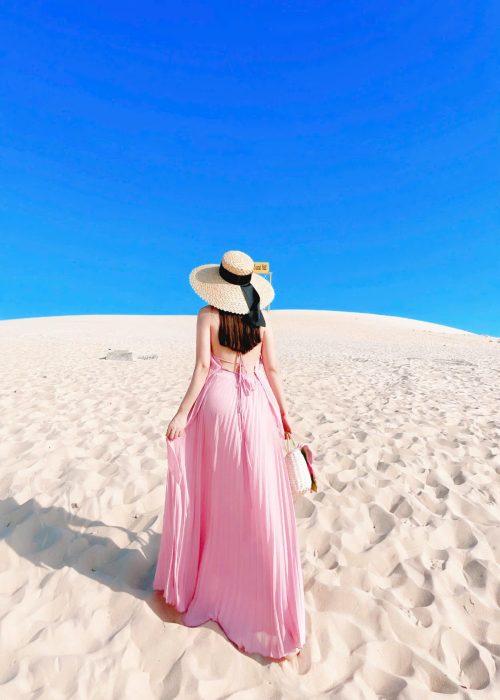 Đầm Maxi Cổ Yếm Xếp Ly Hồng