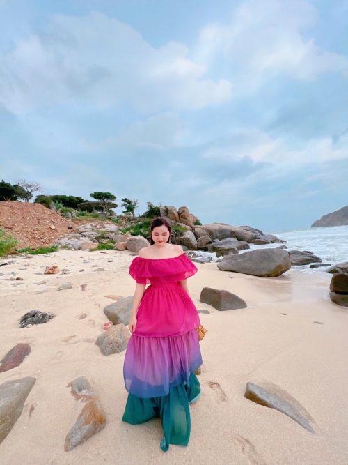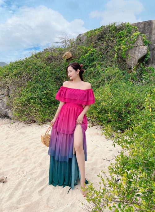 Đầm Maxi Loang Trễ Vai Xẻ Tà
