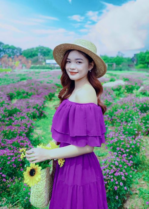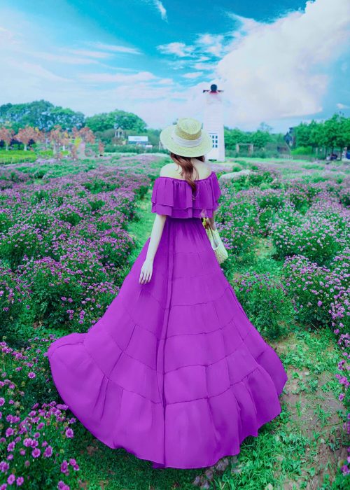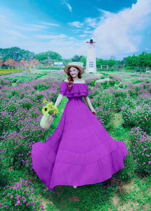 Đầm Maxi Tím Trễ Vai Tà Xòe