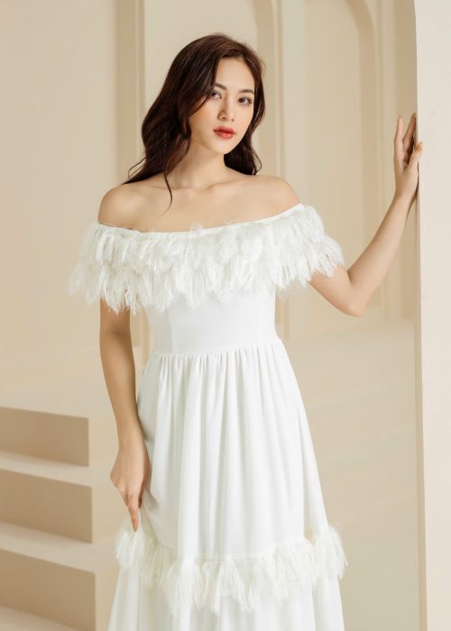 Đầm Maxi Trễ Vai Trắng Phong Cách Tiểu Thư