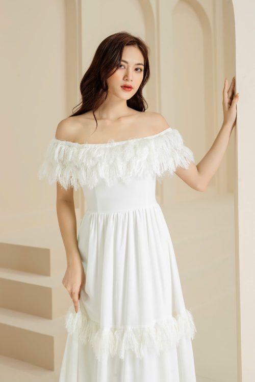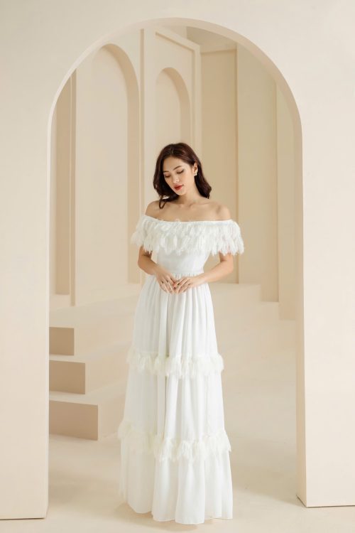 Đầm Maxi Trễ Vai Trắng Phong Cách Tiểu Thư