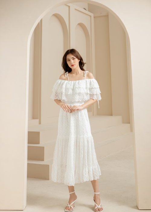 Đầm Maxi Trễ Vai Trắng Ren Hoa Mai