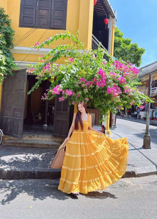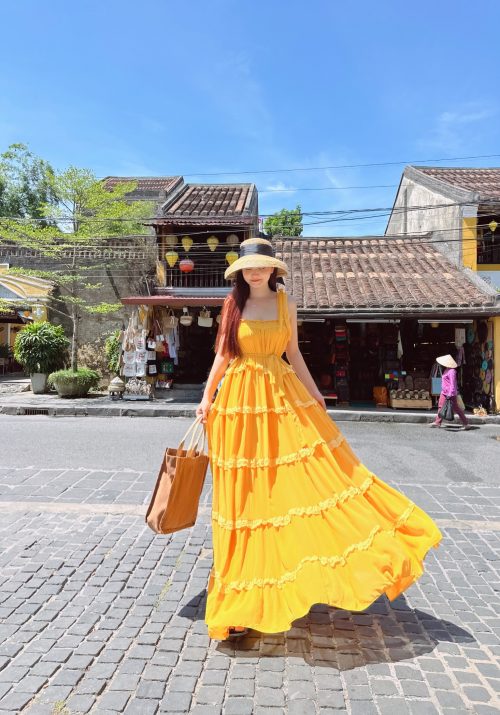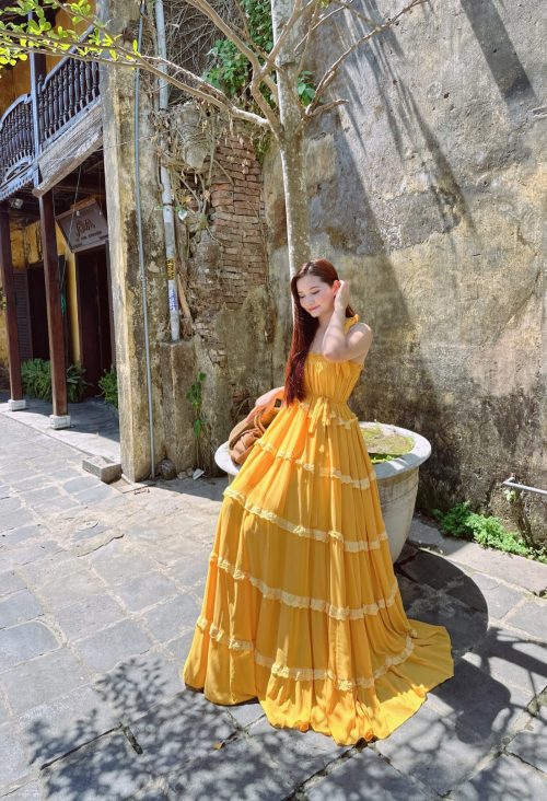 Đầm Maxi Vàng 2 Dây Bèo Tầng