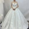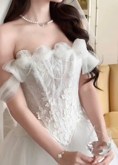 Với váy này là sự lựa chọn hoàn hảo cho những cô dâu yêu thích phong cách thanh lịch và hiện đại. Thiết kế dáng trễ vai tinh tế, tôn lên vóc dáng thon gọn. Điểm nhấn là họa tiết hoa văn được thêu chìm dọc thân váy, tạo cảm giác mềm mại, nữ tính. Chất liệu voan cao cấp với độ bóng nhẹ càng làm tăng thêm vẻ sang trọng, quý phái.