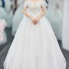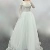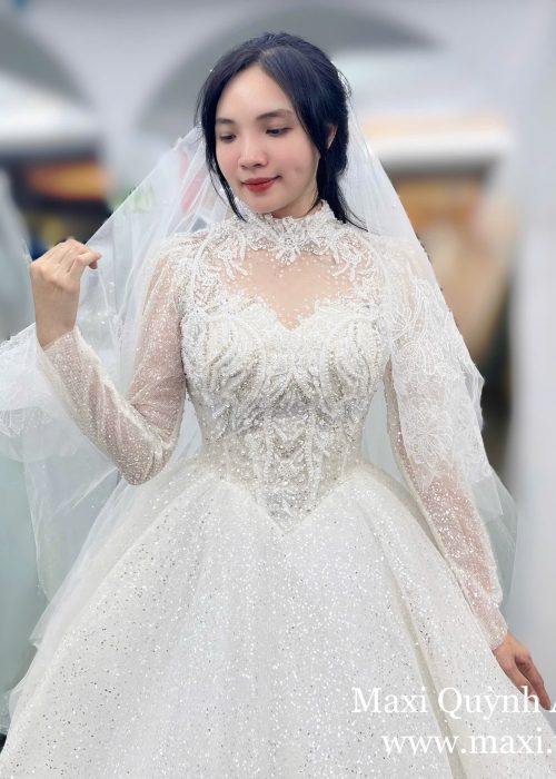 Chiếc váy cưới trắng tinh khôi này thực sự làm em mê mẩn. Thiết kế cổ cao và tay dài bằng vải ren vừa kín đáo, vừa gợi cảm một cách tinh tế. Thân áo ôm sát được đính kết đá lấp lánh và họa tiết ren cầu kỳ, tạo điểm nhấn sang trọng, quý phái. Chân váy xòe bồng bềnh, với lớp kim tuyến phủ đều, lấp lánh như dải ngân hà, khiến mỗi bước đi trở nên vô cùng rực rỡ và cuốn hút.