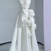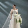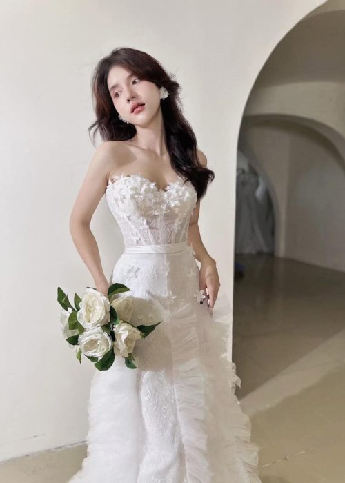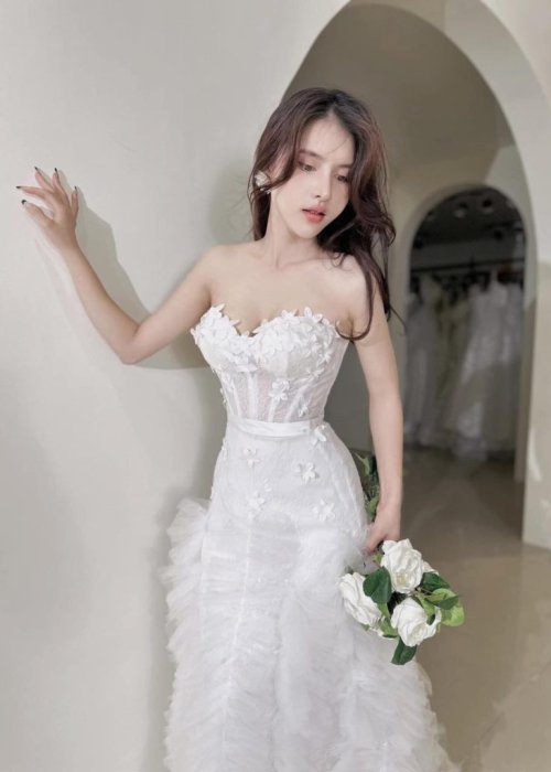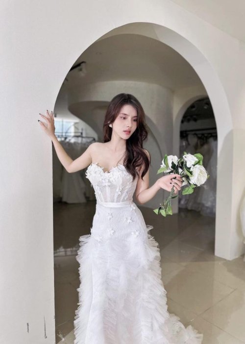 Chiếc váy cưới trắng tinh khôi mang phong cách nhẹ nhàng, bay bổng. Phần thân trên được thiết kế cúp ngực gợi cảm, điểm xuyết các họa tiết ren thêu tinh tế và một lớp voan mỏng quấn quanh eo, tạo vẻ thanh thoát. Chân váy là điểm nhấn độc đáo nhất, được làm từ nhiều lớp vải lưới hoặc voan mỏng xếp ly và tạo hình như những cánh lông vũ mềm mại, bồng bềnh. Các chi tiết này tạo hiệu ứng thị giác ấn tượng, mang lại cảm giác nhẹ nhàng, lãng mạn. Váy được làm từ chất liệu voan/tulle và phụ liệu ren thêu, rất phù hợp cho cô dâu yêu thích sự phá cách nhưng vẫn giữ được nét nữ tính, ngọt ngào.
