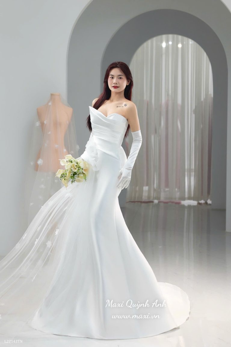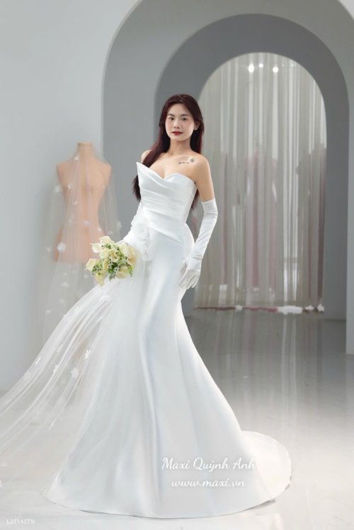 Một chiếc váy cưới sở hữu form dáng đuôi cá ôm sát, tôn vinh đường cong quyến rũ và mang lại vẻ đẹp thanh lịch, hiện đại. Thiết kế cúp ngực với chi tiết xếp nếp tinh tế tạo điểm nhấn sang trọng cho phần thân trên. Điểm đặc biệt của chiếc váy là phần tà voan dài thướt tha được đính ở eo, tạo sự bay bổng và lãng mạn như một chiếc váy cưới cổ điển.