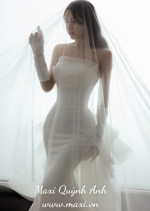 Chất liệu chính, váy sử dụng chất liệu phi lụa cao cấp, có độ dày dặn và độ đứng phom nhất định. Chất liệu này có bề mặt mờ/bóng nhẹ, mang lại vẻ sang trọng, không cần đính kết cầu kỳ nhưng vẫn đẳng cấp.
