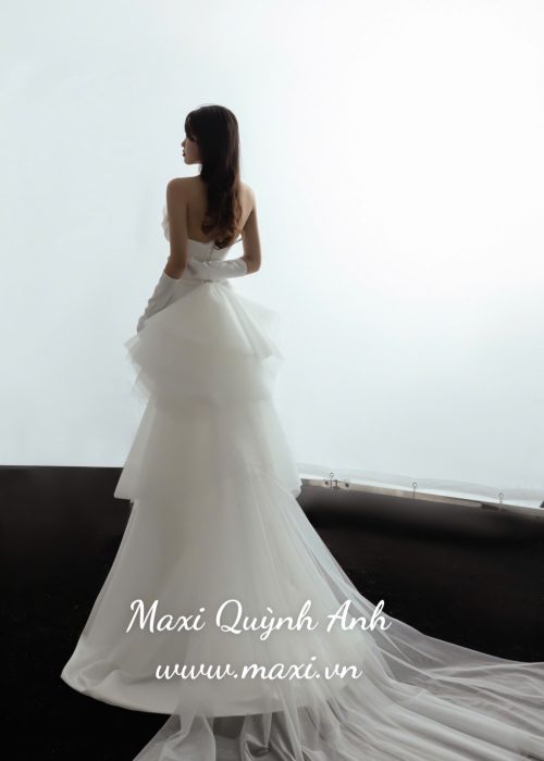 Điểm nhấn sau lưng/vòng eo, điểm đặc biệt là chi tiết nơ lớn hoặc tùng váy xếp ly bồng bềnh (như trong ảnh) được gắn phía sau eo hoặc hông. Chi tiết này không chỉ tạo điểm nhấn thị giác độc đáo mà còn tăng thêm sự kịch tính và nét duyên dáng cho chiếc váy khi nhìn từ phía sau.