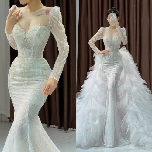 Chiếc váy cưới “THIÊN NGA TRẮNG” là sự lựa chọn hoàn hảo cho những nàng dâu yêu thích phong cách thanh lịch, kín đáo nhưng vẫn đầy quyến rũ. Thiết kế này tôn vinh vẻ đẹp thuần khiết và sự lãng mạn bất tận của tình yêu.