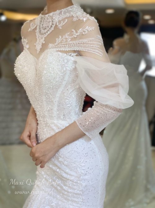 💎 Phần corset ôm sát eo kết hợp với dáng đuôi cá tôn đường cong giúp nàng dâu khoe trọn vóc dáng mềm mại. Điểm nhấn chính là phần tay ren dài xuyên thấu cùng thiết kế cổ tim kết hợp dáng trễ vai tạo nên vẻ đẹp vừa thanh lịch vừa ngọt ngào.