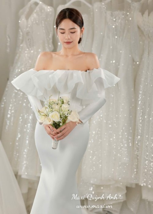 Chiếc váy cưới với sự kết hợp hoàn hảo giữa nét gợi cảm và sự tinh tế, mang đến một vẻ đẹp lộng lẫy và hiện đại. form dáng đuôi cá ôm sát cơ thể giúp tôn lên mọi đường cong quyến rũ của người mặc. Thiết kế trễ vai với phần bèo nhún mềm mại tạo điểm nhấn nữ tính, đồng thời khéo léo khoe bờ vai thon thả.