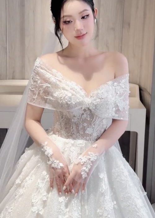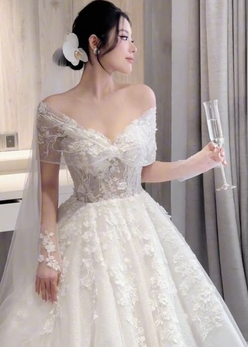Form dáng xòe phồng (ball gown) bồng bềnh, tạo sự thướt tha và duyên dáng. Điểm nhấn là thiết kế trễ vai tinh tế kết hợp với phần tay áo con bằng ren mềm mại, khoe khéo bờ vai thanh mảnh và xương quai xanh quyến rũ. Phần thân áo được siết eo corset đầy gợi cảm, giúp tôn lên đường cong hoàn hảo.
