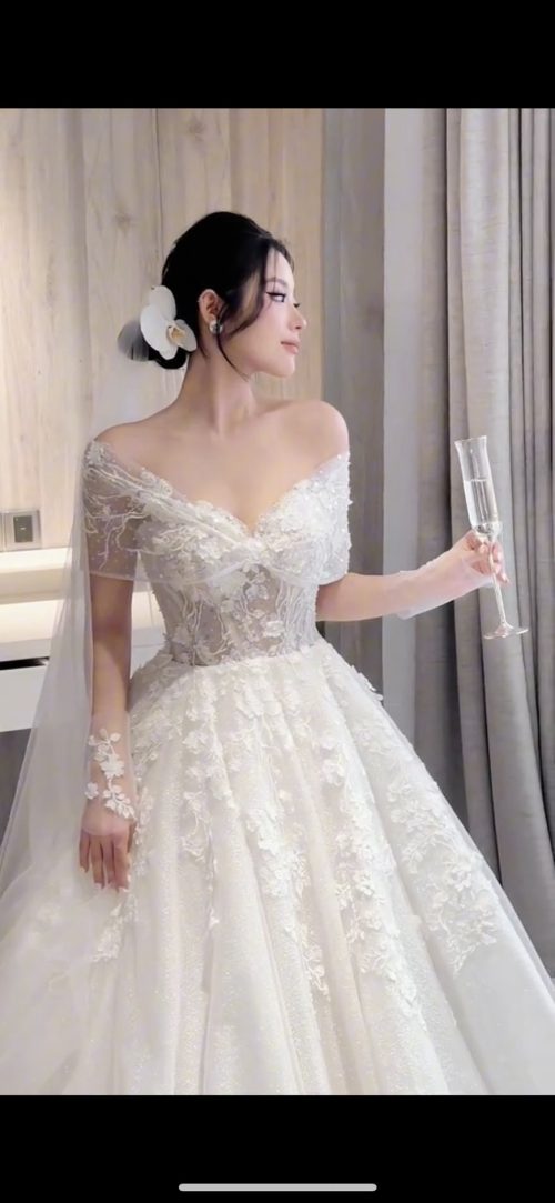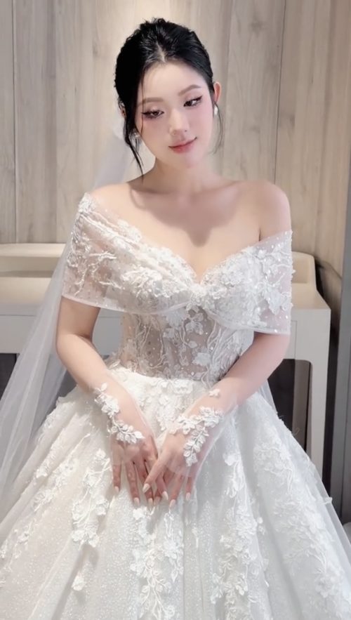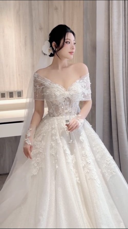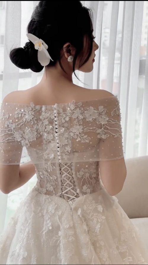 Form dáng xòe phồng (ball gown) bồng bềnh, tạo sự thướt tha và duyên dáng. Điểm nhấn là thiết kế trễ vai tinh tế kết hợp với phần tay áo con bằng ren mềm mại, khoe khéo bờ vai thanh mảnh và xương quai xanh quyến rũ. Phần thân áo được siết eo corset đầy gợi cảm, giúp tôn lên đường cong hoàn hảo.
