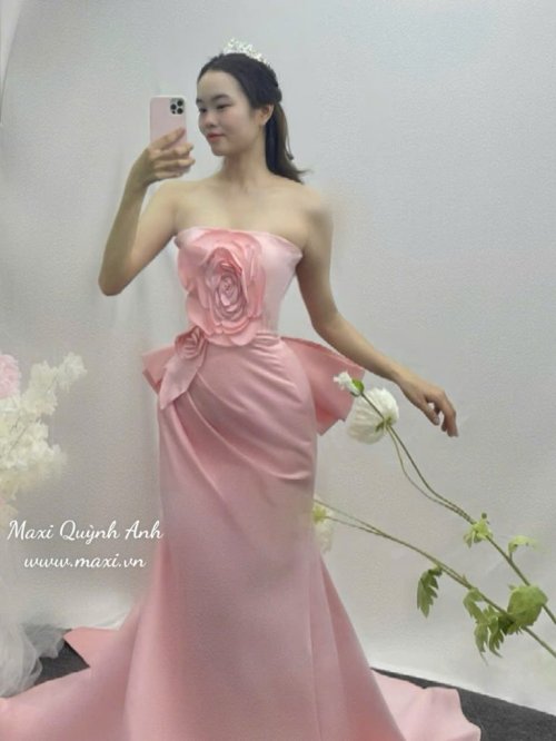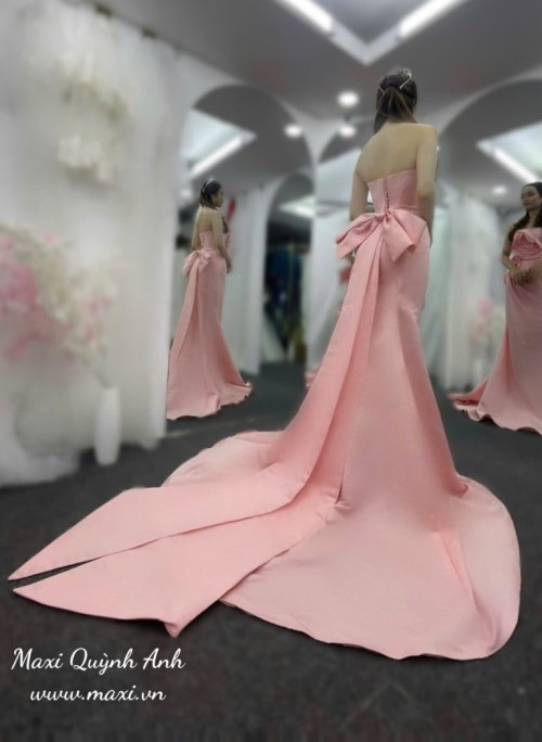 Váy Cưới Body Cúp Ngực Hồng Kèm Nơ – Sang Trọng, Quyến Rũ Cho Ngày Trọng Đại