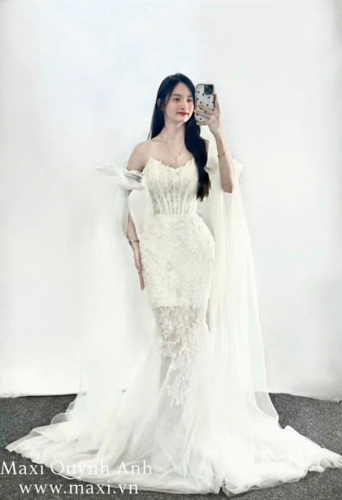 🌹 Phần đuôi cá dài thướt tha kết hợp cùng lớp vải voan mềm mại mang lại hiệu ứng bay bổng, giúp từng bước đi của nàng uyển chuyển và sang trọng. Đặc biệt, thiết kế vai rơi mềm mại tựa cánh hoa chính là chi tiết làm nên điểm nhấn – một váy cưới hot trend được nhiều cô dâu săn đón, bởi sự dễ thu hút và nổi bật ở mọi góc nhìn.